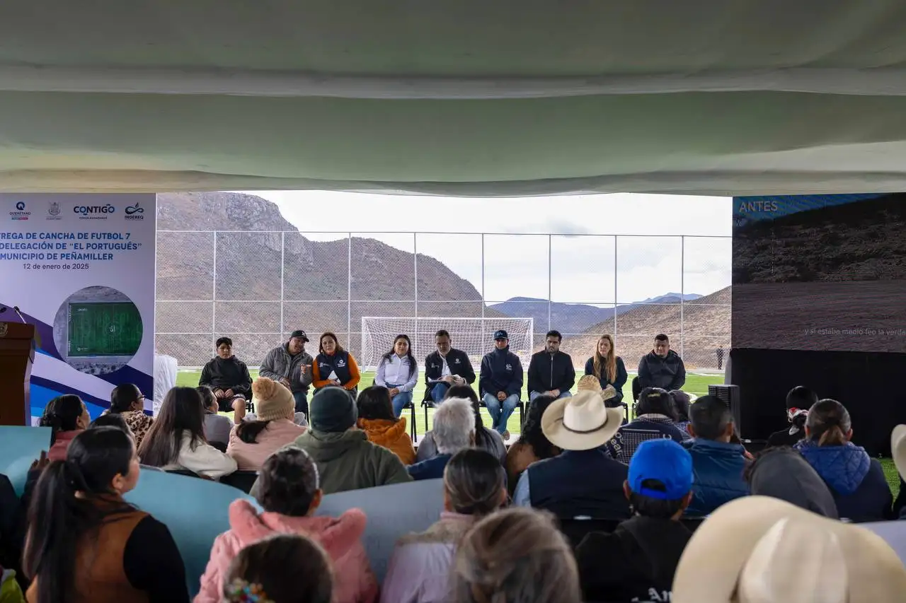 En la comunidad de El Portugués, municipio de Peñamiller, el gobernador de Querétaro, Mauricio Kuri González, entregó una cancha de fútbol 7 como parte de los esfuerzos para fomentar estilos de vida saludables y recuperar espacios de convivencia social. Este proyecto beneficiará a 19 mil habitantes del municipio, incluyendo de manera directa a 753 personas de la comunidad.