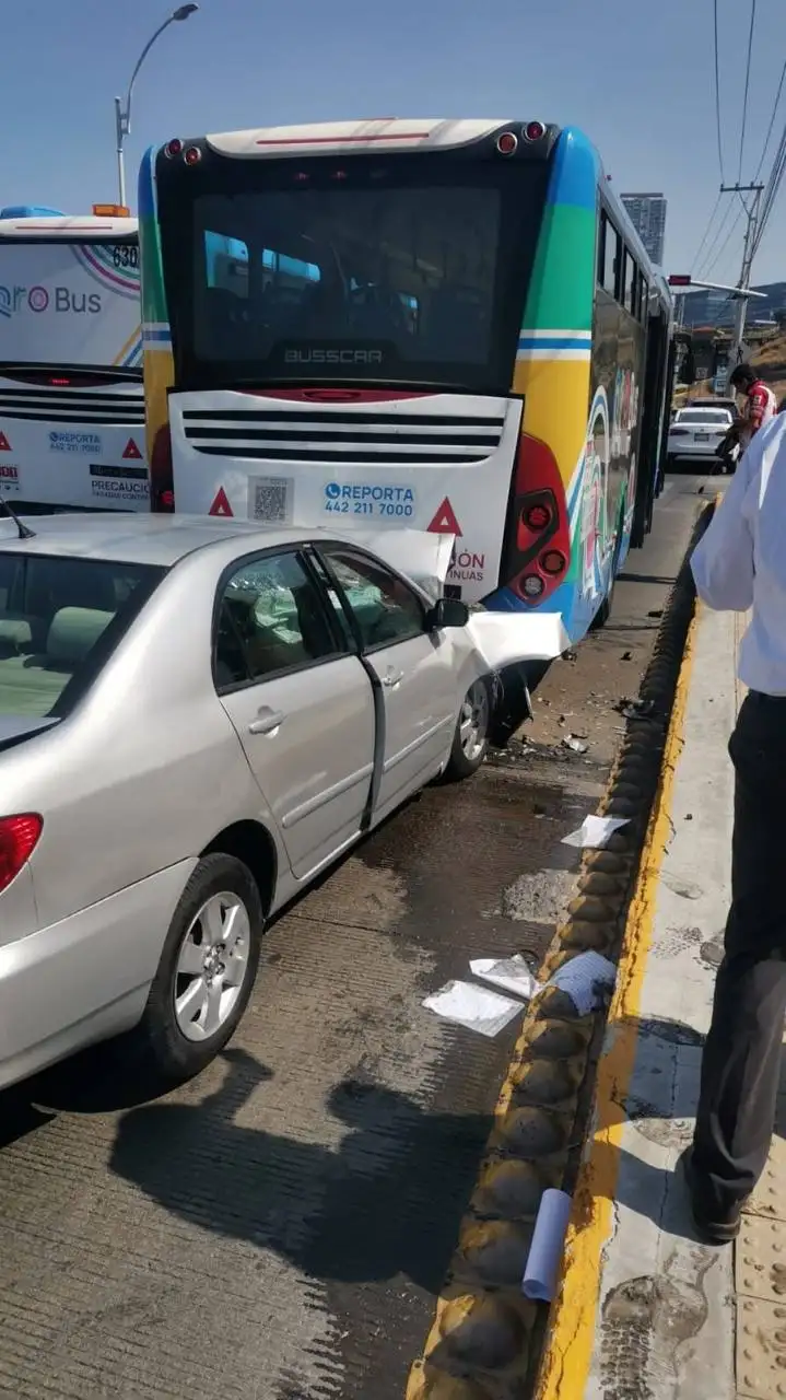 Un fuerte accidente de tránsito ocurrió en Prolongación Constituyentes, cuando un automóvil particular colisionó violentamente contra la parte trasera de una unidad del transporte público Qrobús, la cual se encontraba detenida en el parabús Bicentenario para el descenso de pasajeros.