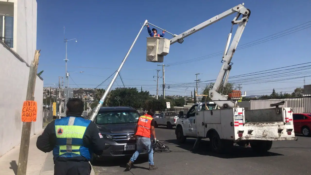 Con el apoyo de la Guardia Vial de la Secretaría de Seguridad Pública Municipal de Querétaro, se realizan maniobras para liberar el vehículo afectado. Las autoridades recomiendan a los residentes y conductores evitar la zona y seguir las indicaciones de los cuerpos de emergencia para garantizar la seguridad de todos.
