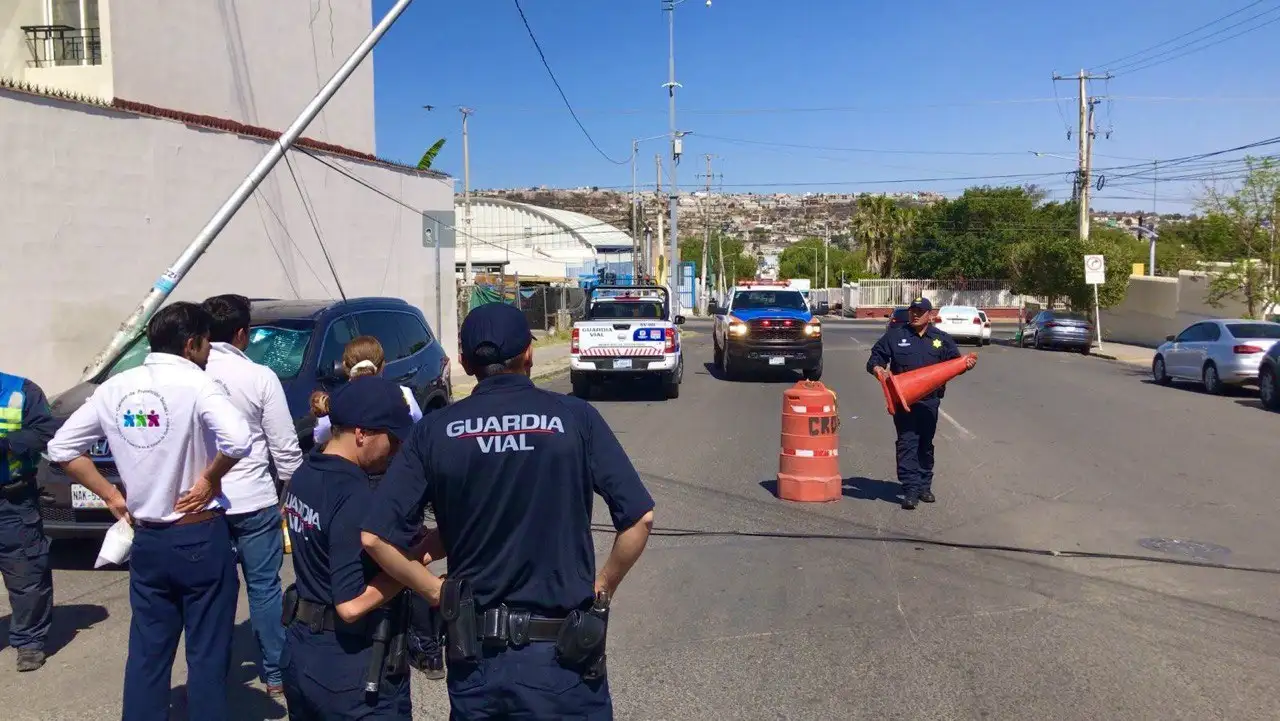 A las 15:30 horas de hoy, se reportó un incidente vial en la Col. San Pedrito Los Arcos, donde un vehículo de carga impactó un poste de alumbrado público, provocando su caída sobre un automóvil estacionado. Al llegar al sitio, se identificaron cables colgando, por lo que se procedió con el retiro del cableado para reducir riesgos en la zona.