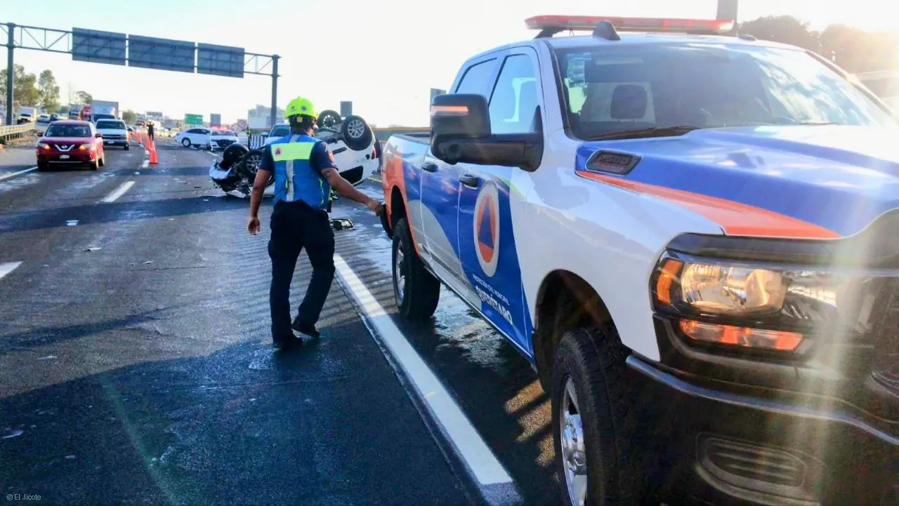 Un aparatoso accidente se registró en la Carretera Federal 57, donde un vehículo de carga pesada impactó contra un automóvil particular, provocando que este último volcara sobre la vialidad.