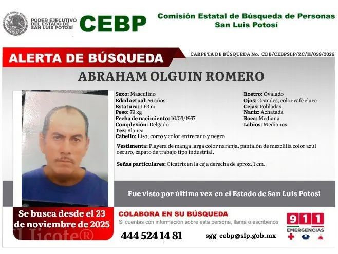 Se solicita el apoyo de la ciudadanía para localizar a Abraham Olguín Romero, quien fue visto por última vez en el estado de San Luis Potosí el 23 de noviembre de 2025.