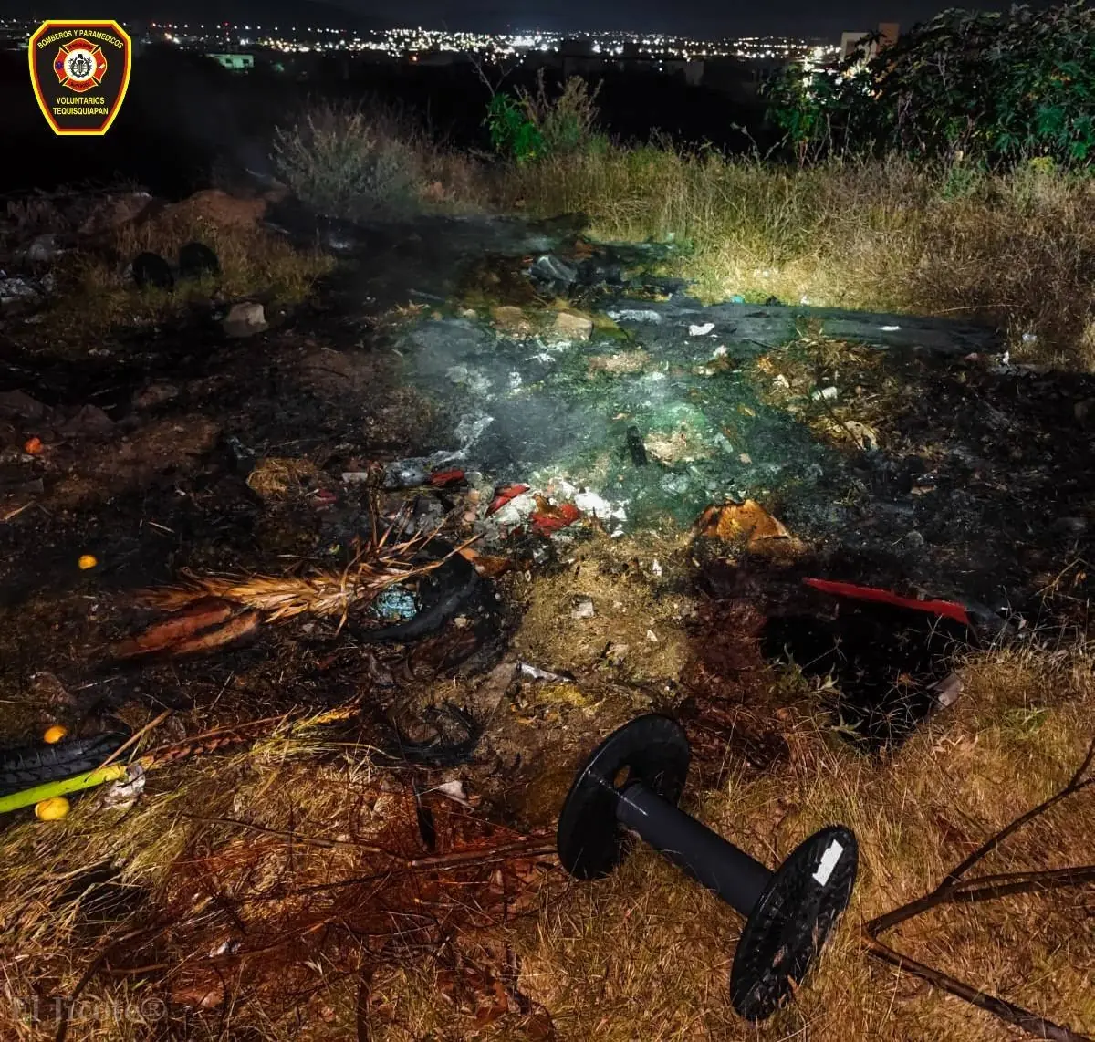 El cuerpo de Bomberos Voluntarios de Tequisquiapan atendió durante la madrugada un incendio de montículos de poda, desechos comunes, plásticos y llantas, logrando controlar el fuego antes de que se propagara a zonas cercanas.