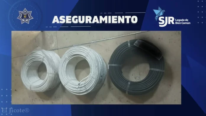 Elementos de la Secretaría de Seguridad Pública Municipal de San Juan del Río detuvieron a dos hombres tras atender un reporte realizado a la línea de emergencias 9-1-1, en el que se informó que colocaron etiquetas apócrifas en rollos de cable para pagar una cantidad menor en un establecimiento ubicado en la colonia Valle de Oro.