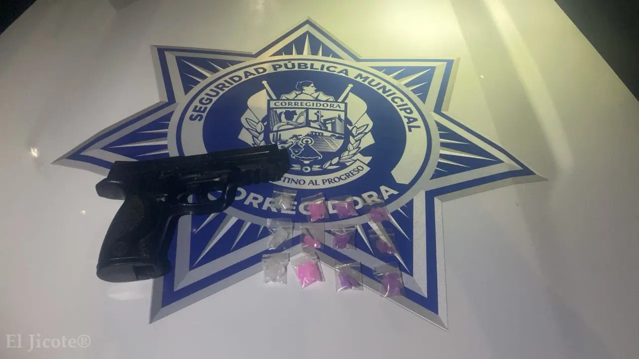 Tras realizarle una inspección preventiva, se le encontró una réplica de arma de fuego y 12 bolsitas con sustancia granulada con características similares a la metanfetamina.