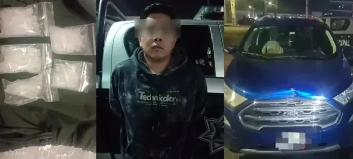 Finalmente, los policías lograron interceptar al automóvil y proceder a una revisión. Durante la inspección del vehículo, localizaron varias bolsas que contenían sustancias con características similares al cristal, por lo que se procedió al aseguramiento inmediato del individuo.