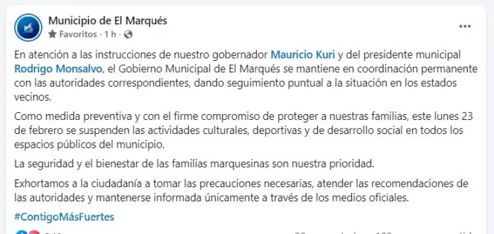 El Gobierno Municipal de El Marqués informó que, en atención a las instrucciones del gobernador Mauricio Kuri González y del presidente municipal Rodrigo Monsalvo Castelán, se mantiene en coordinación permanente con las autoridades correspondientes ante la situación registrada en estados vecinos.