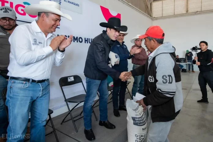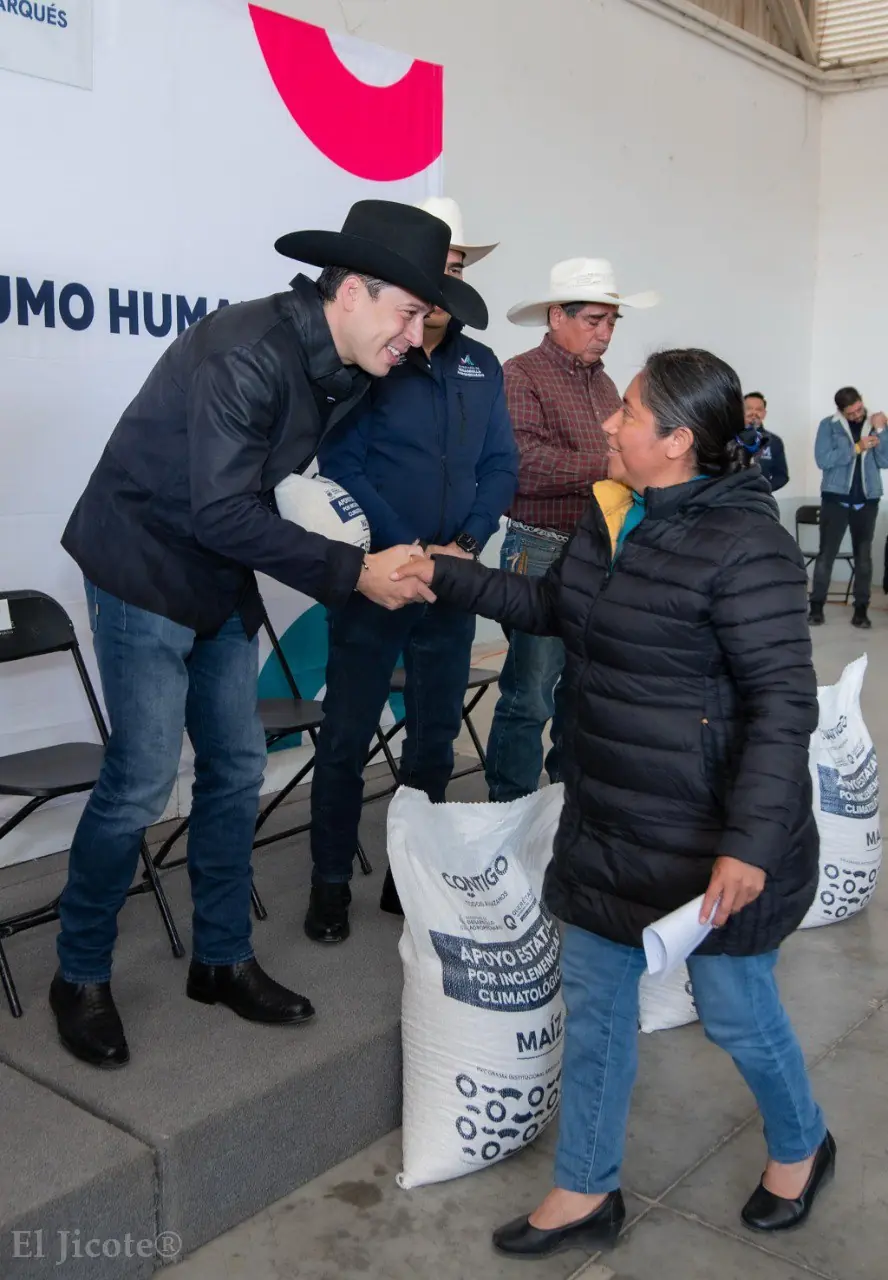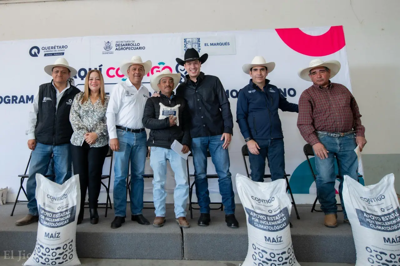 El presidente municipal de El Marqués, Rodrigo Monsalvo Castelán, junto con el secretario de Desarrollo Agropecuario (SEDEA) del estado de Querétaro, Rosendo Anaya Aguilar, encabezaron la entrega de 479 toneladas de grano de maíz para consumo humano a productores locales durante 2025, ante afectaciones derivadas del cambio climático.