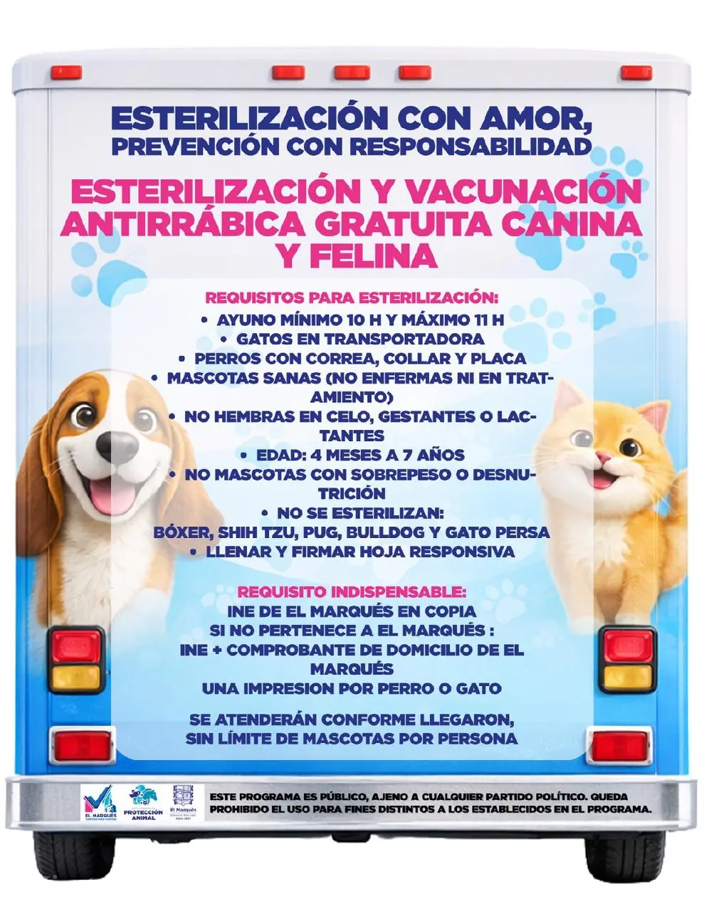 Entre los requisitos indispensables se solicita copia de INE con domicilio en El Marqués y copia de comprobante de domicilio, una por cada mascota que recibirá el servicio. Asimismo, se informó que los animales deberán cumplir con un ayuno mínimo de 10 horas y máximo de 11 horas, sin alimento sólido ni agua, como medida fundamental para garantizar un procedimiento seguro.