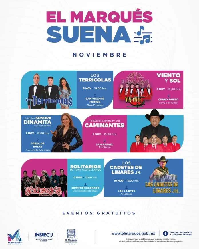 El Instituto del Deporte y Cultura El Marqués (INDECU) anunció el inicio del programa musical ¡El Marqués Suena! para hoy, miércoles 5 de noviembre, en la comunidad de San Vicente Ferrer a las 19:00 horas.