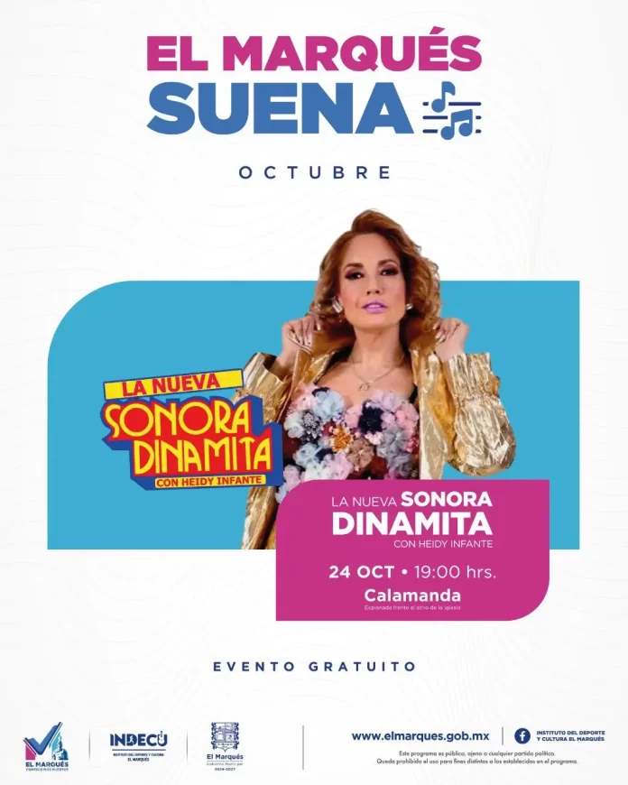 El Instituto del Deporte y Cultura de El Marqués invita a la ciudadanía a disfrutar de una noche llena de ritmo y alegría con la presentación de La Nueva Sonora Dinamita con Heidy Infante, este jueves 24 de octubre a las 7:00 p. m., en la comunidad de Calamanda.