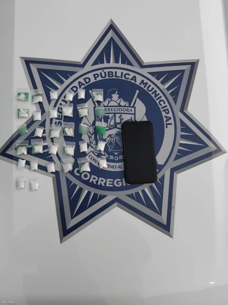 Con base en las características físicas proporcionadas, los oficiales localizaron al posible responsable, quien adoptó una actitud evasiva al notar la presencia policial. Tras realizar una entrevista e inspección preventiva, se le encontró en posesión de 32 bolsitas con una sustancia granulada similar a la metanfetamina, además del teléfono móvil previamente reportado como robado.
