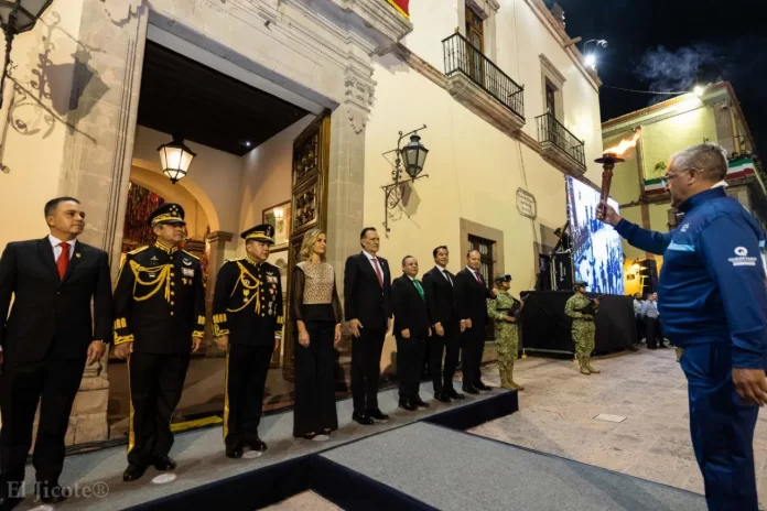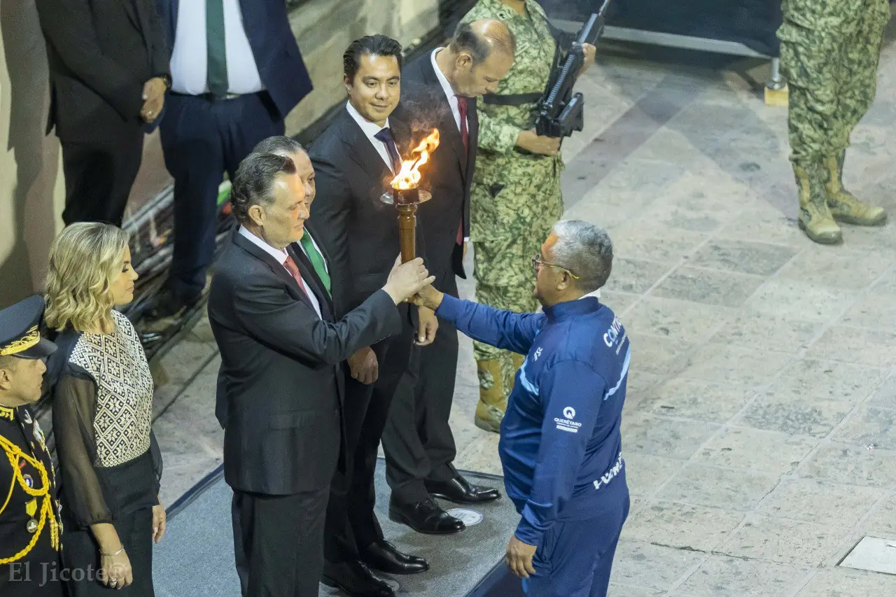 Acompañado por representantes de los poderes Legislativo y Judicial, así como por su familia e invitados especiales, el titular del Ejecutivo ondeó la Bandera del Batallón de Infantería Permanente Ligero de Querétaro, entregada momentos antes por la escolta de la Legislatura. Asimismo, recibió el fuego simbólico de la “Carrera de la Conspiración de 1810” y un presente del pueblo y gobierno de Dolores Hidalgo, Guanajuato, como símbolo de hermandad histórica.