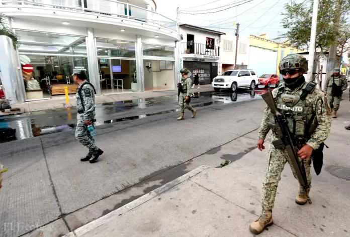 Militares mantienen vigilancia en el establecimiento denominado Funerales La Paz, ubicado en la colonia San Andrés, donde serían velados los restos del líder del Cártel Jalisco Nueva Generación (CJNG).