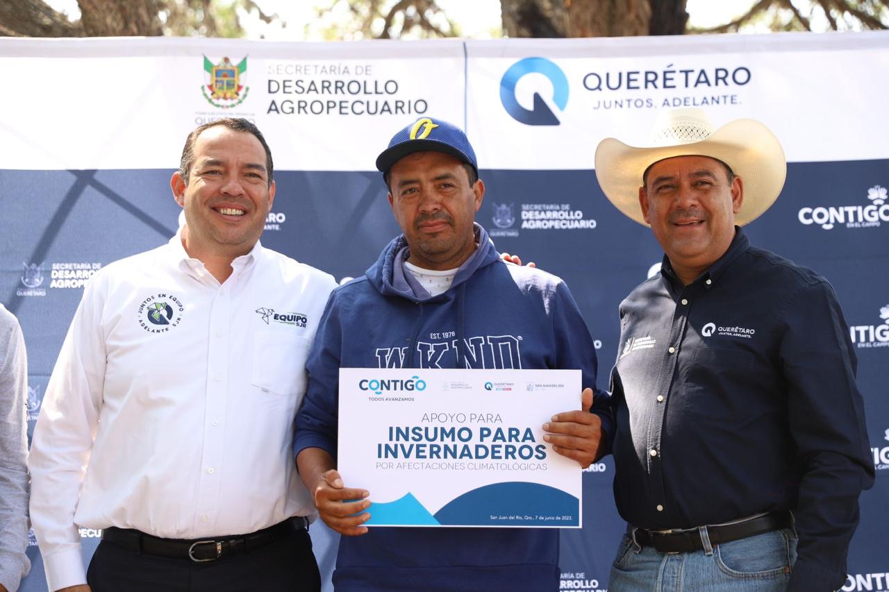 El secretario de Desarrollo Agropecuario, Rosendo Anaya, encabezó la entrega de apoyos para más de 50 productores de la comunidad El Organal, en San Juan del Río, quienes tuvieron afectaciones en sus cultivos de rosas a causa de fuertes vientos que se presentaron en mayo.