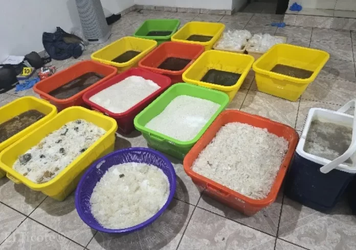 Según la carpeta de investigación, al arribar al lugar para verificar una denuncia sobre presuntos hechos delictivos, los elementos de seguridad fueron recibidos con disparos de arma de fuego. En respuesta, se detuvo a Jerhemy “G” y Gael “G”, y se aseguraron diversos objetos, entre ellos un arma de fuego corta, un cargador, siete cartuchos de diferentes calibres, metanfetamina, así como garrafones de plástico con precursores químicos.
