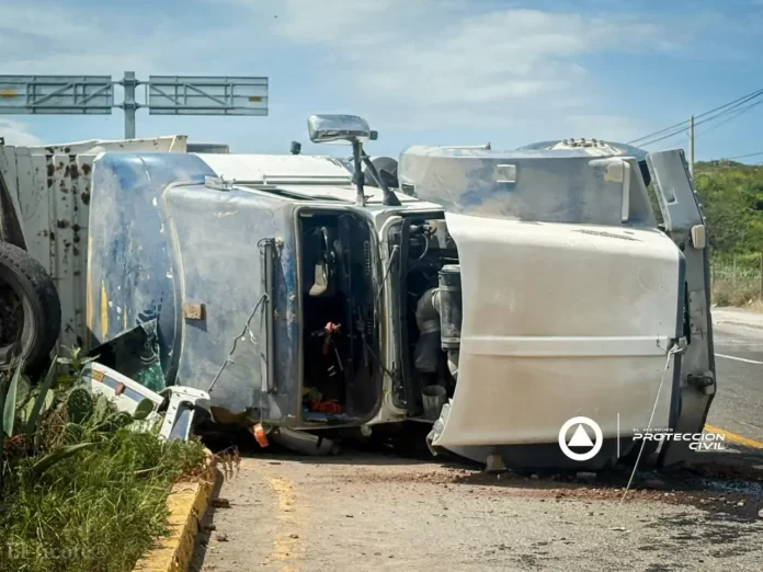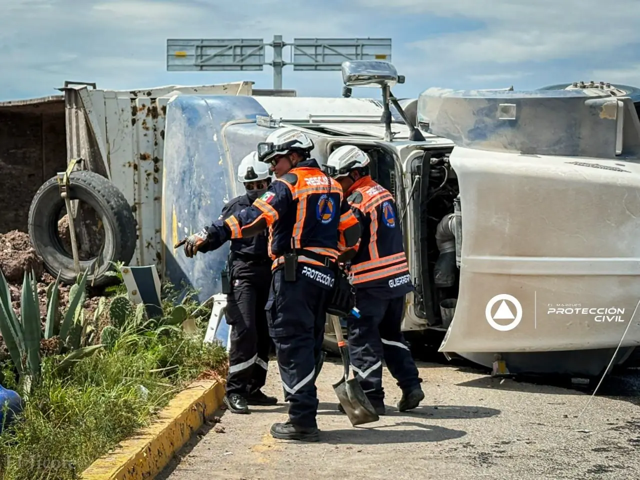 Elementos de Protección Civil de El Marqués atendieron la volcadura de un tractocamión de volteo ocurrida sobre la carretera estatal 540, a la altura de la conexión con la autopista federal 57D.