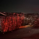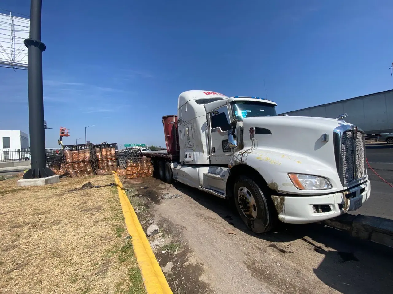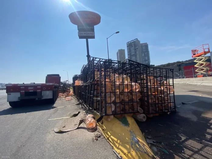 De acuerdo con los primeros reportes, el conductor del tractocamión perdió el control de la unidad, provocando que esta se volcara y la caja quedara recostada sobre el camellón. El tráiler transportaba garrafones de agua, mismos que quedaron dispersos tras el accidente.